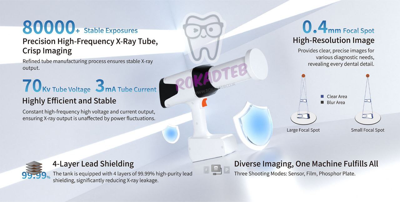 مدل پایه HyperLight یک دستگاه سبک، قابل حمل و بسیار کاربردی است که با باتری لیتیوم-یون کار میکند. این دستگاه با تیوب DC ساخت توشیبا ژاپن مجهز شده که موجب کاهش زمان اکسپوز و ثبت تصاویری شفاف و دقیق میشود. این کیفیت بالا برای تشخیص پوسیدگیها، مشکلات ریشه و ضایعات دندانی اهمیت زیادی دارد و باعث میشود دندانپزشکان تصمیمگیری سریعتر و مطمئنتری داشته باشند.